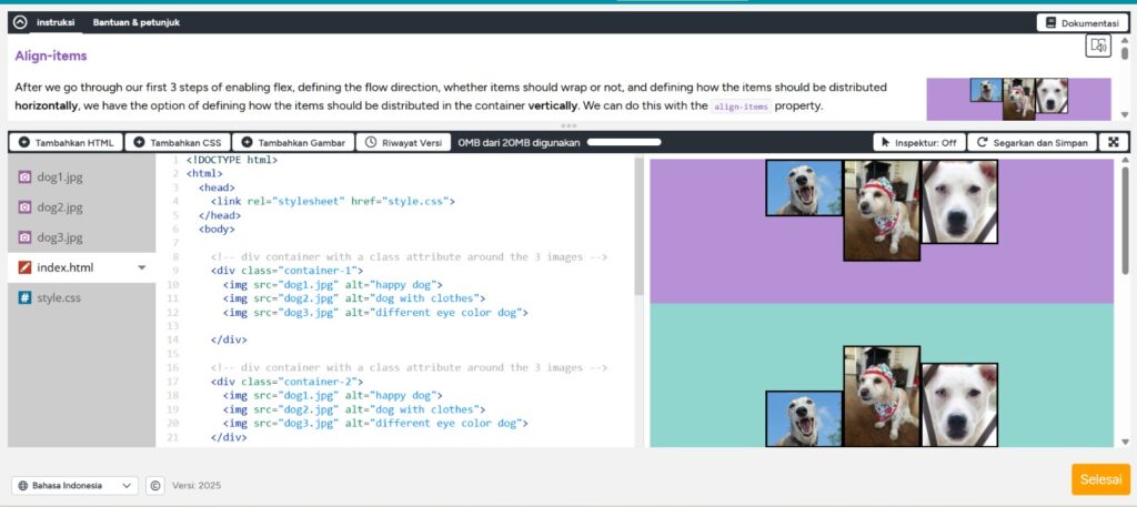 oke di Lvl ke4 ini hampir sama, ada containernya seperti di lvl 3 cuma beda propertinya aja kali ini adalahAlign-items valuenya : flex-start; flex-end; center; baseline; stretch;