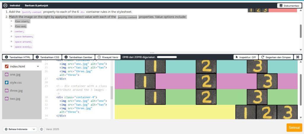 jdi Lvl 3 ini, kita disuruh menambahkan properti justify-content ke setiap dari 6 aturan kontainer div di stylesheet. yang dari awal gambar nya tersusun jadi buat seperti gambar yg ada di atas↑